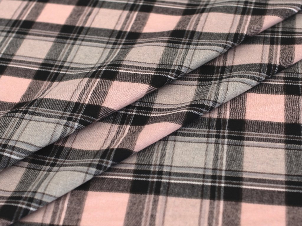 Flanelová látka růžovo-šedo-černá kostka je tkaná v plátnové vazbě, díky čemuž je pevná, odolná proti roztržení i tření a zároveň se vyznačuje stálostí barev. Tento flanel je měkký a příjemný na omak, proto se skvěle hodí na košile, šaty, sukně, pyžama nebo domácí oblečení. Využít ho můžete také pro ložní prádlo a interiérové doplňky, které díky němu získají útulný vzhled.