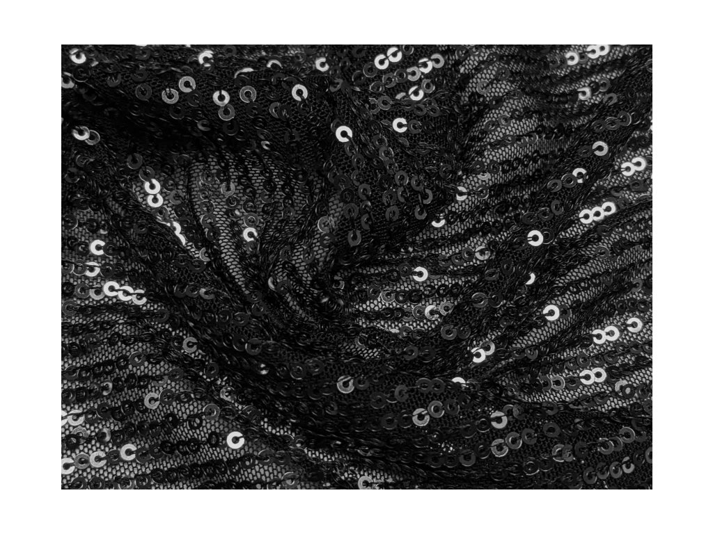 Flitrová látka v černé barvě je pružná, průsvitná a lesklá. Vhodná k výrobě oděvů pro výjimečné události a příležitosti, na elegantní společenské šaty, tuniky, halenky, šaty a sukně.