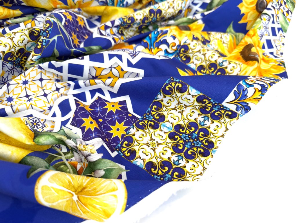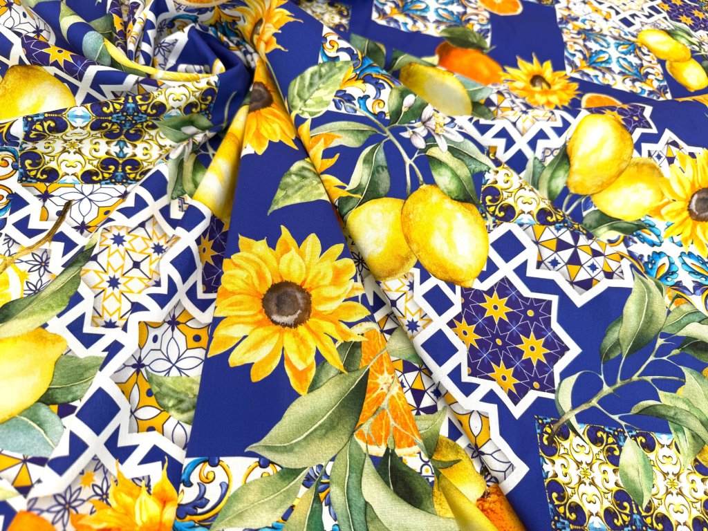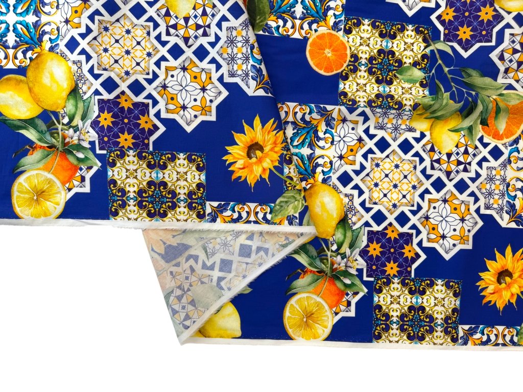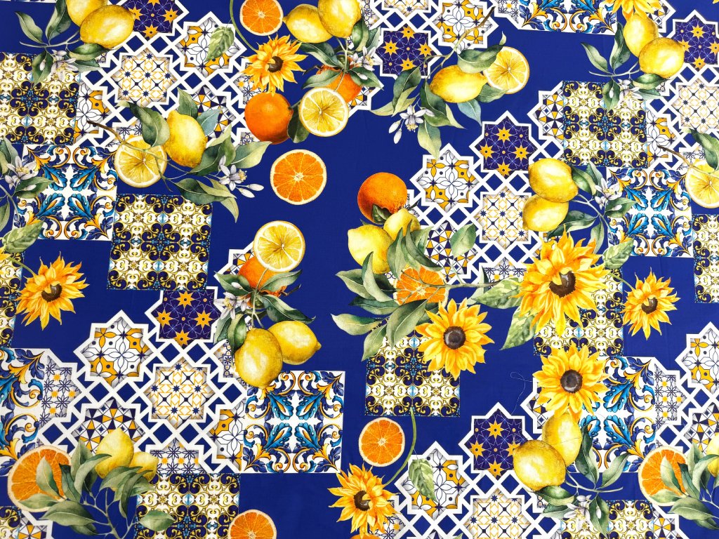 Italská bavlna – Slunečnice a citrusy na modrém podkladu