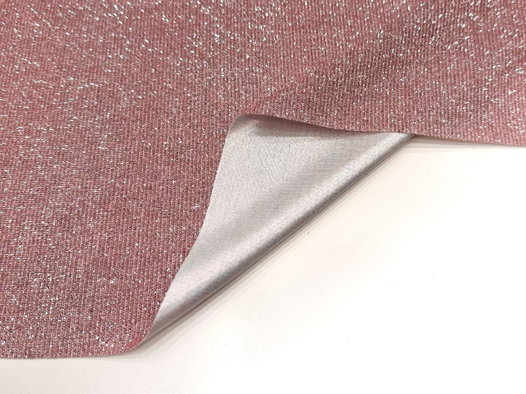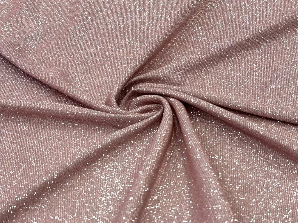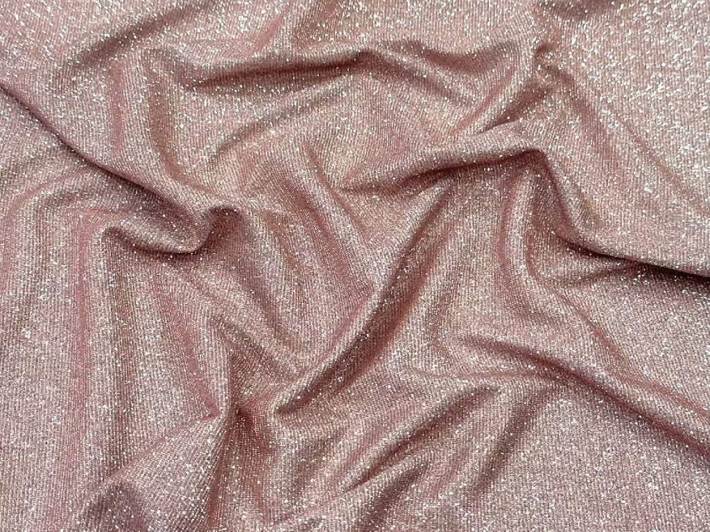 Společenský třpytivý úplet s lesklým povrchem, který na světle nádherně září a vytváří elegantní glamour efekt. Díky úpletové struktuře je látka příjemná na dotek, krásně splývá a při pohybu vytváří efektní světelné odlesky, díky tomu působí luxusně a dokonale připraveně na večerní události.