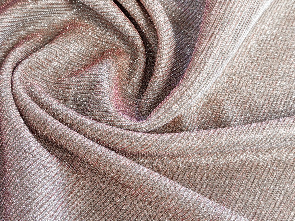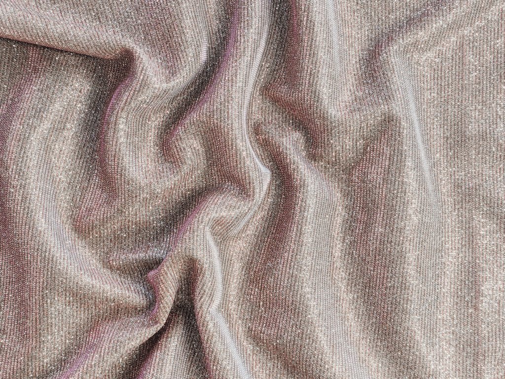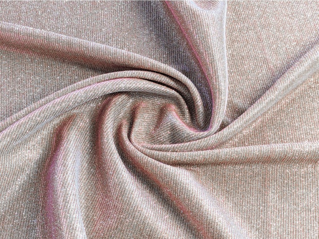 Společenský třpytivý úplet s lesklým povrchem, který na světle nádherně září a vytváří elegantní glamour efekt. Díky úpletové struktuře je látka příjemná na dotek, krásně splývá a při pohybu vytváří efektní světelné odlesky, díky tomu působí luxusně a dokonale připraveně na večerní události.