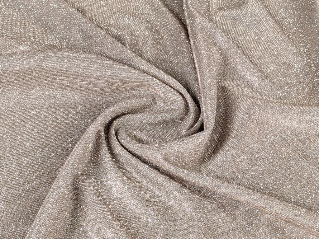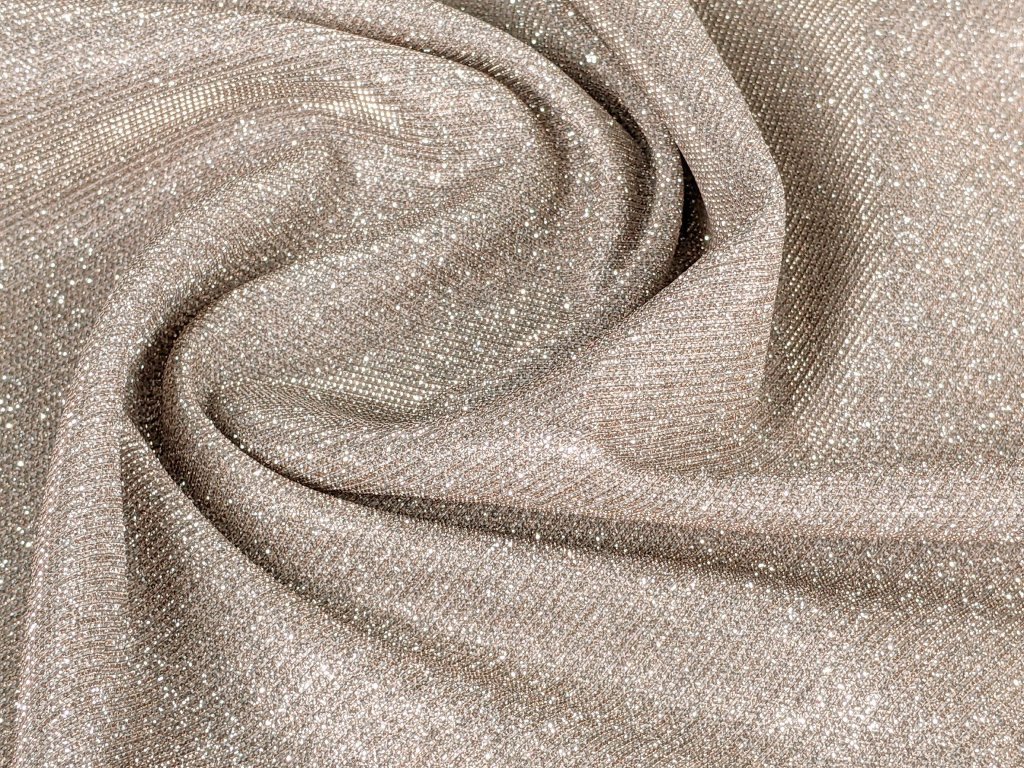 Společenský třpytivý úplet s lesklým povrchem, který na světle nádherně září a vytváří elegantní glamour efekt. Díky úpletové struktuře je látka příjemná na dotek, krásně splývá a při pohybu vytváří efektní světelné odlesky, díky tomu působí luxusně a dokonale připraveně na večerní události.