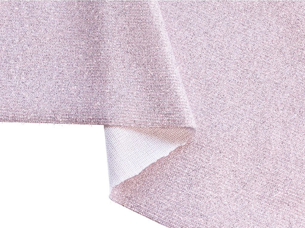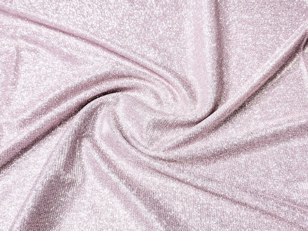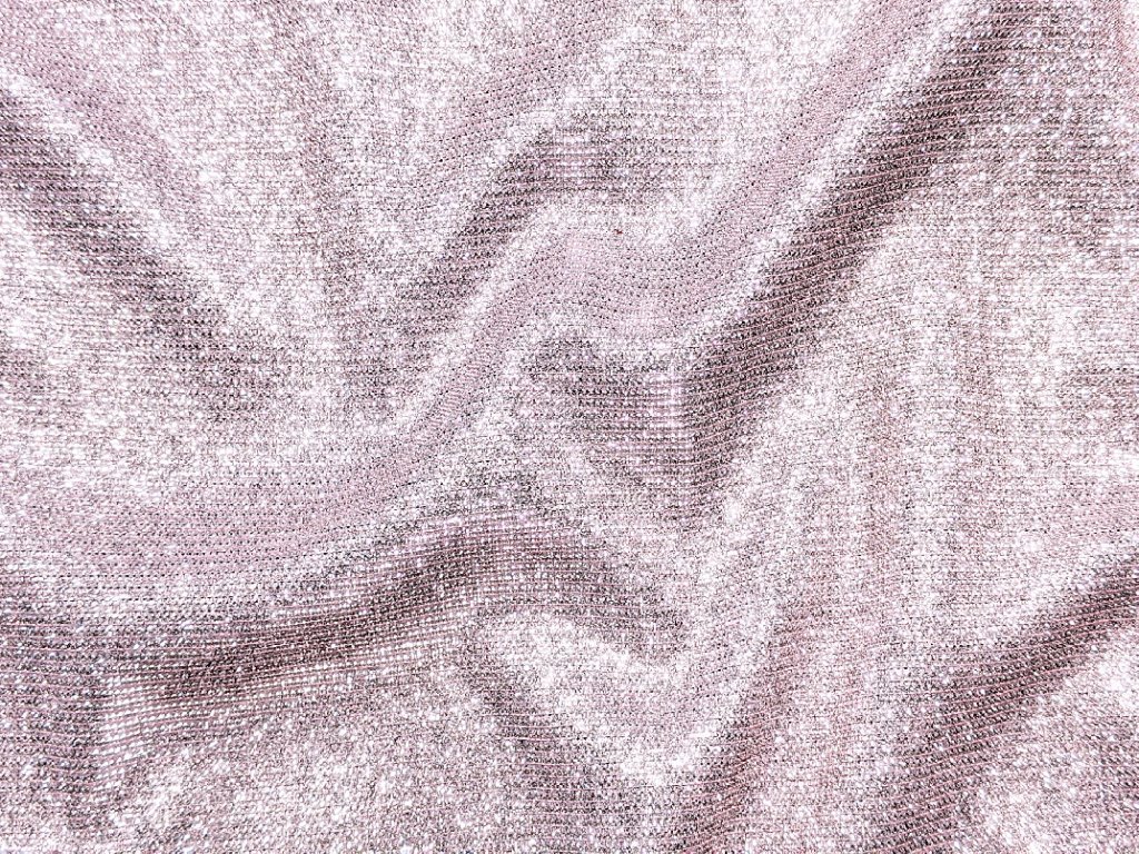 Společenský třpytivý úplet s lesklým povrchem, který na světle nádherně září a vytváří elegantní glamour efekt. Díky úpletové struktuře je látka příjemná na dotek, krásně splývá a při pohybu vytváří efektní světelné odlesky, díky tomu působí luxusně a dokonale připraveně na večerní události.