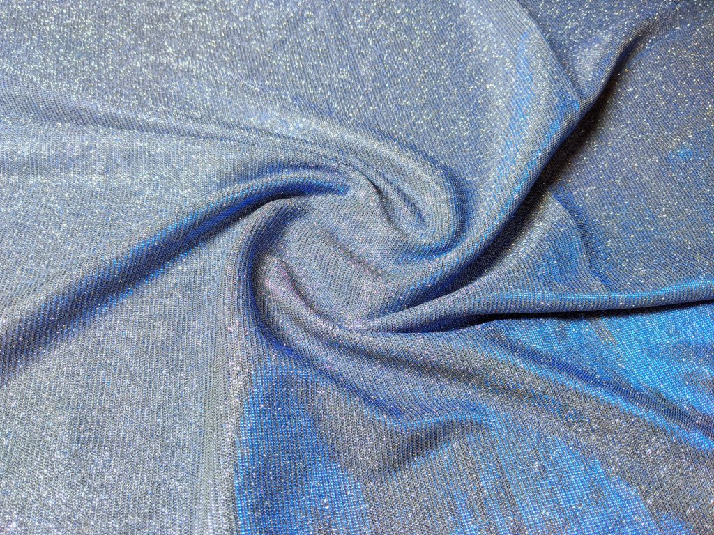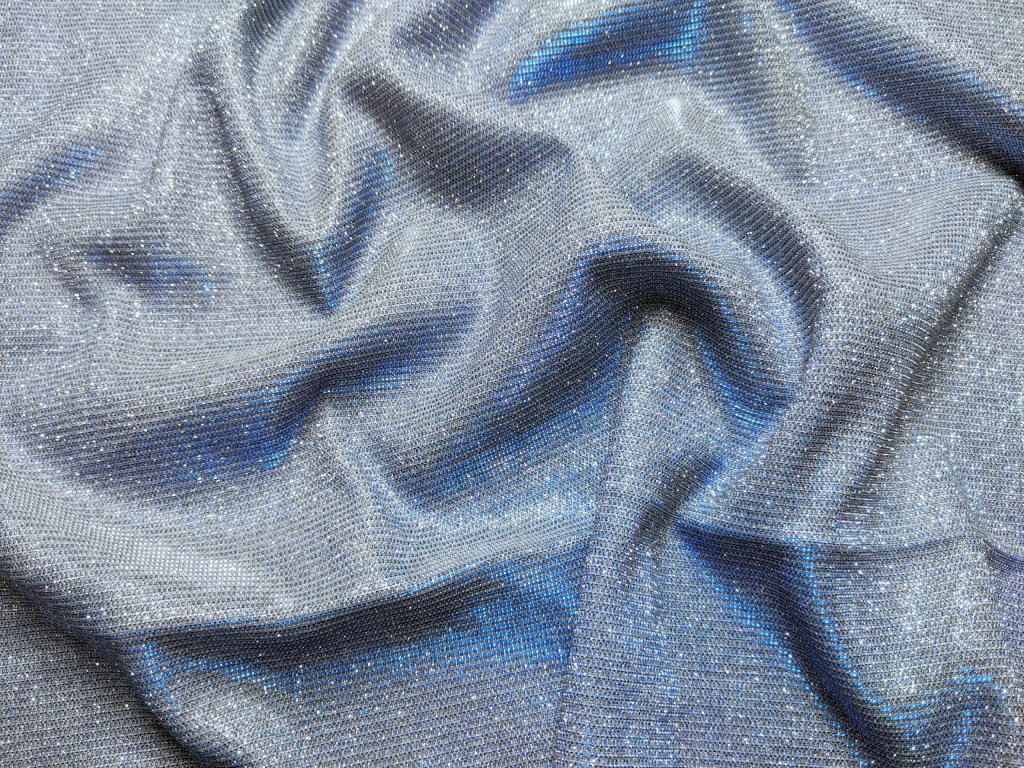 Společenský třpytivý úplet s lesklým povrchem, který na světle nádherně září a vytváří elegantní glamour efekt. Díky úpletové struktuře je látka příjemná na dotek, krásně splývá a při pohybu vytváří efektní světelné odlesky, díky tomu působí luxusně a dokonale připraveně na večerní události.