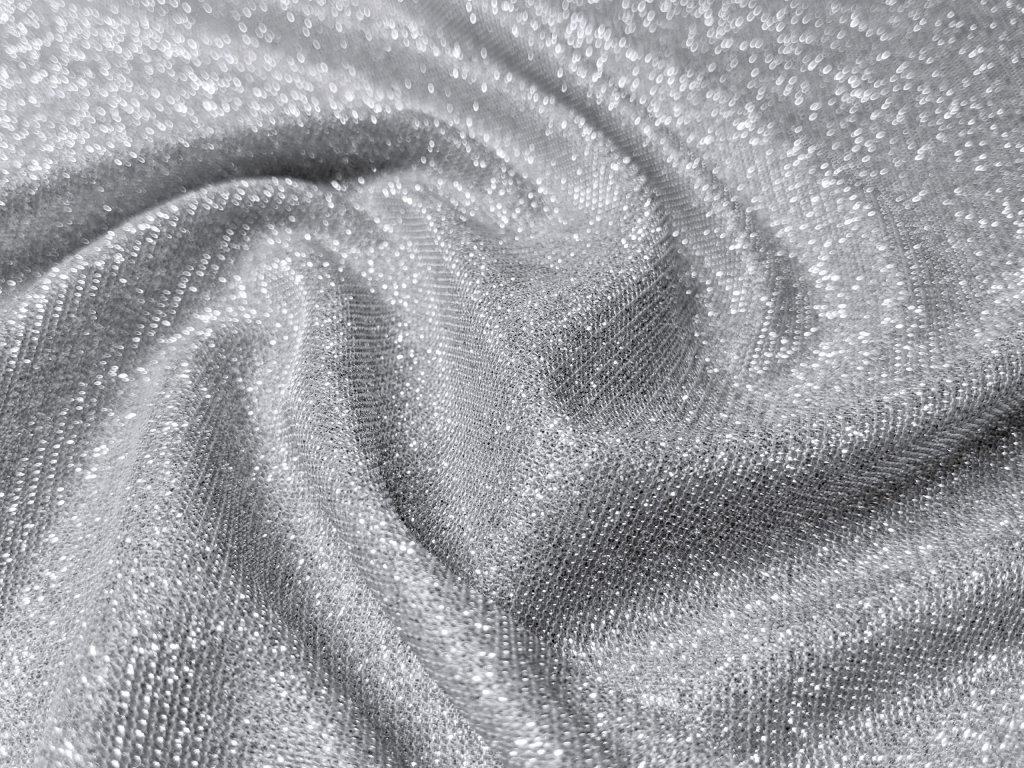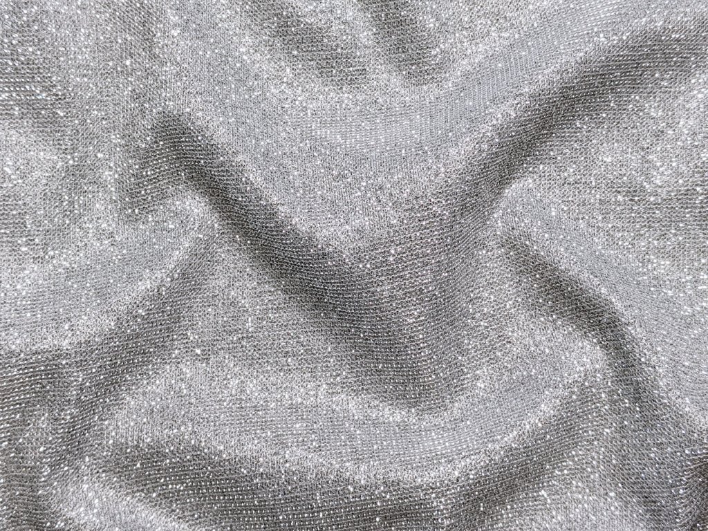 Společenský třpytivý úplet s lesklým povrchem, který na světle nádherně září a vytváří elegantní glamour efekt. Díky úpletové struktuře je látka příjemná na dotek, krásně splývá a při pohybu vytváří efektní světelné odlesky, díky tomu působí luxusně a dokonale připraveně na večerní události.