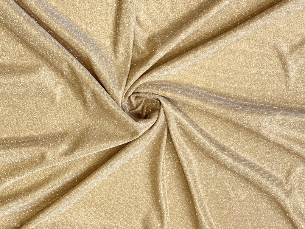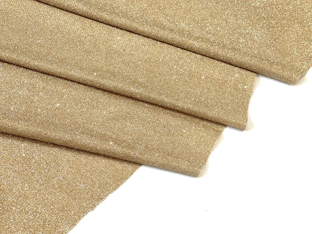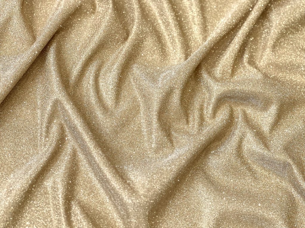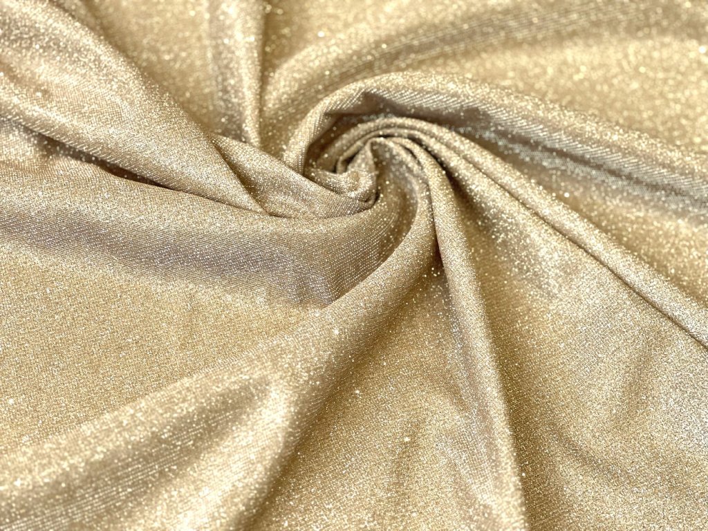 Společenský třpytivý úplet s lesklým povrchem, který na světle nádherně září a vytváří elegantní glamour efekt. Díky úpletové struktuře je látka příjemná na dotek, krásně splývá a při pohybu vytváří efektní světelné odlesky, díky tomu působí luxusně a dokonale připraveně na večerní události.