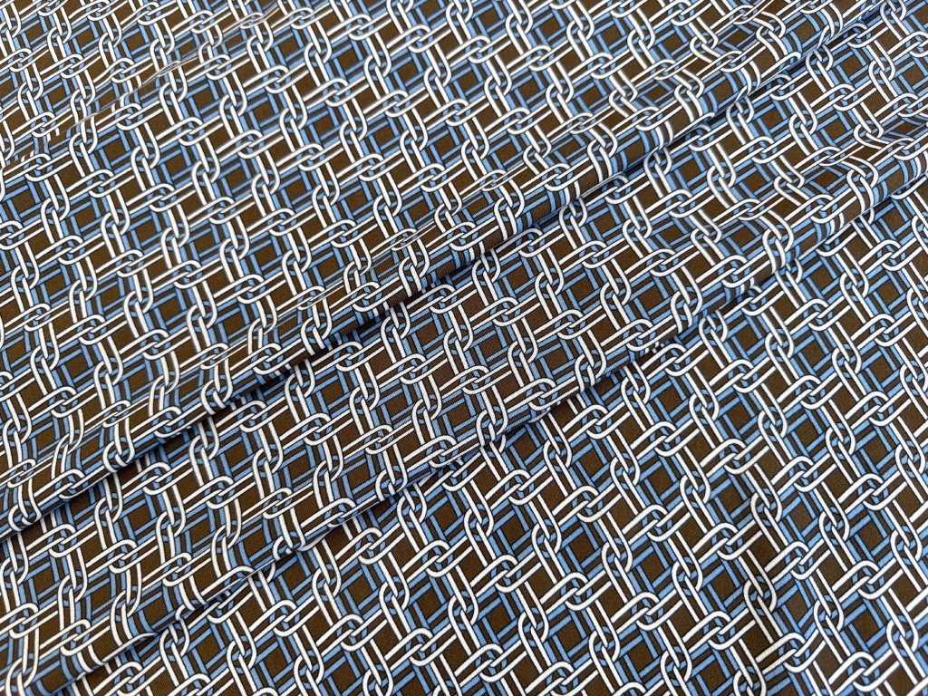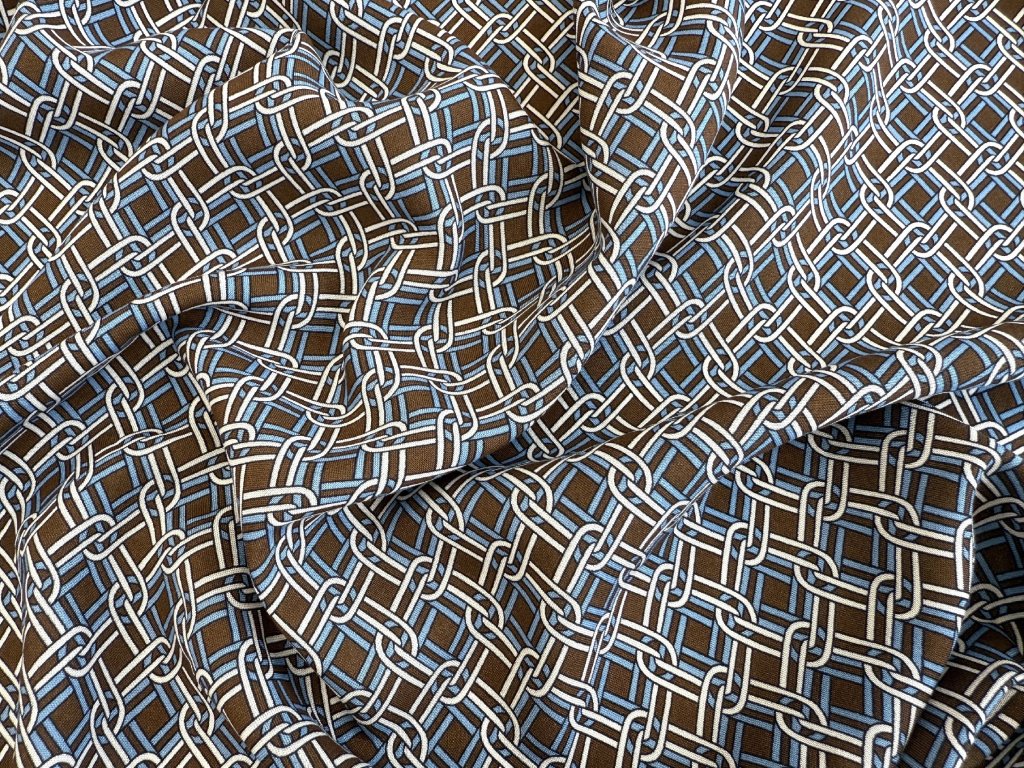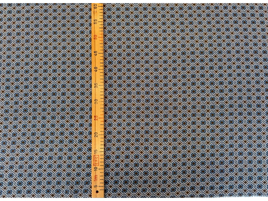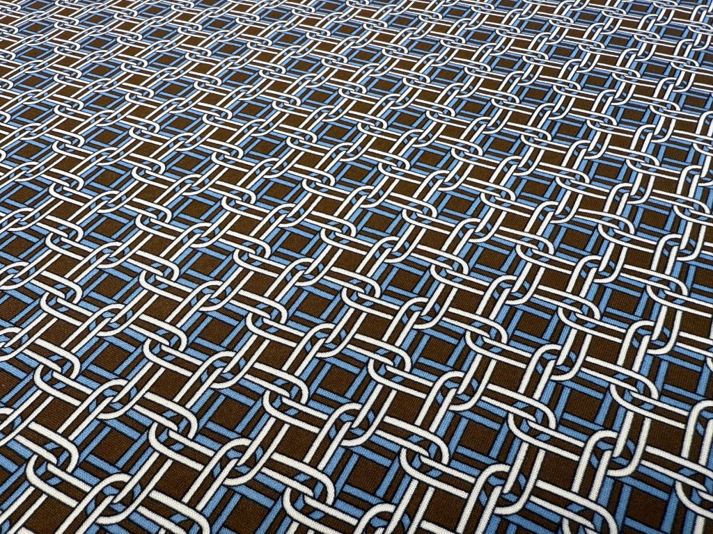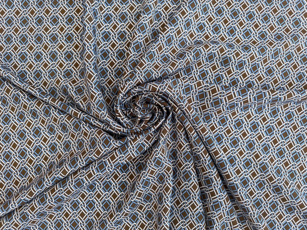 Viskózová látka s geometrickým vzorem – hnědo-modrá, řetízkový motiv