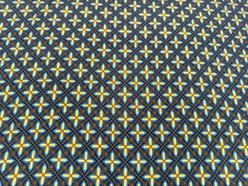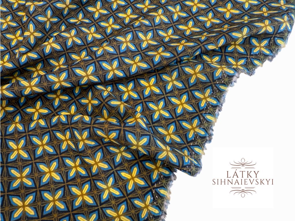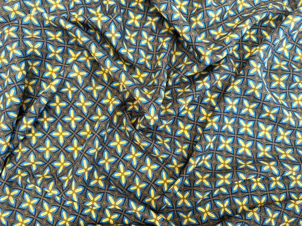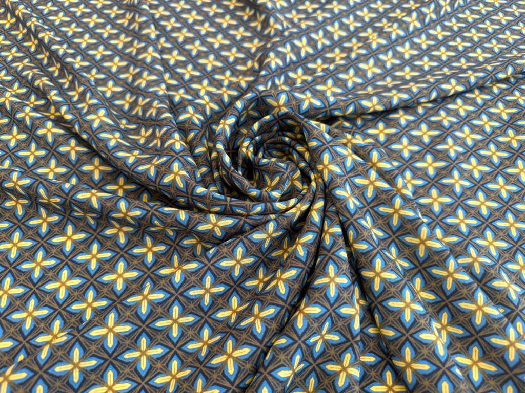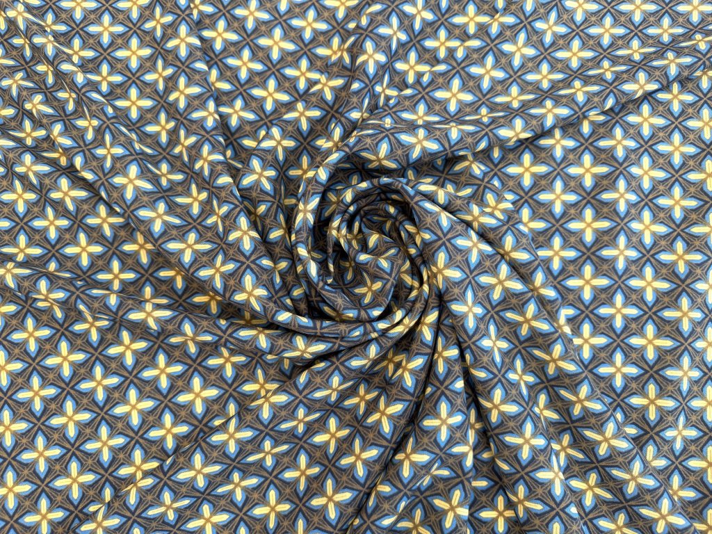 Letní viskózová šatovka je matná, splývavá a nepruží, má jemný, pravidelný vzor připomínající stylizované květiny nebo hvězdy v geometrickém uspořádání. Motiv tvoří krémově žluté květy s modrými detaily, umístěné do tmavě hnědého a námořnicky modrého podkladu s jemnými konturami připomínajícími diamantovou mřížku. Celkový dojem působí retro, ale stále elegantně a nositelně. Látka je vhodná na širokou škálu oděvů, zejména na letní šaty, kalhoty, halenky, overaly, sukně a tuniky. Látka je poddajná a proto se s ní snadno pracuje.