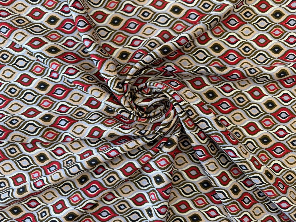 Viskózová látka neprosvítá, je matná, poddajná a splývavá, což zajišťuje pohodlí při nošení i snadné zpracování při šití. Díky svému orientálnímu geometrickému designu dodá vašemu outfitu šmrnc a jedinečnost. Látka je vhodná na širokou škálu oděvů, zejména na letní šaty, kalhoty, halenky, overaly, sukně a tuniky.