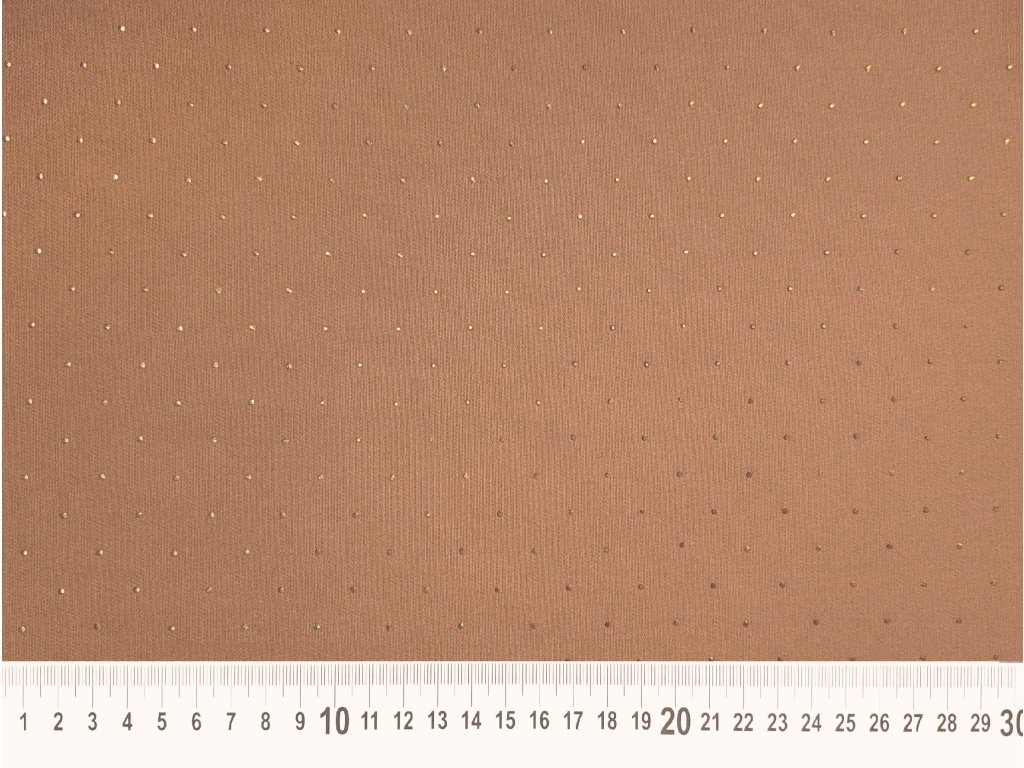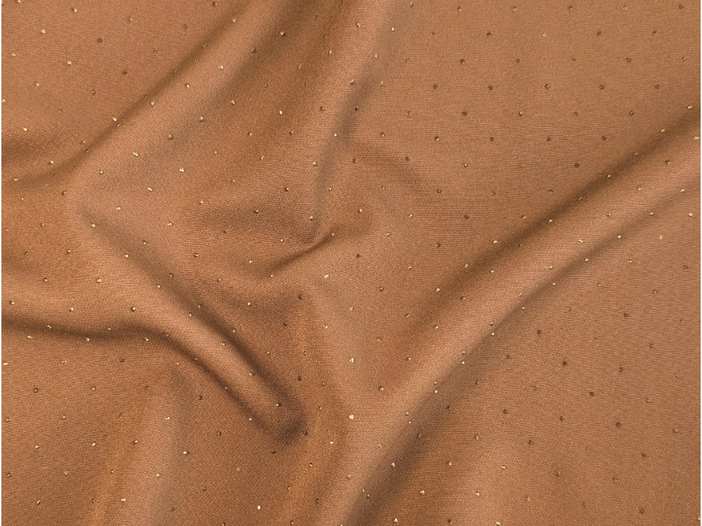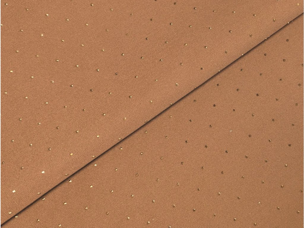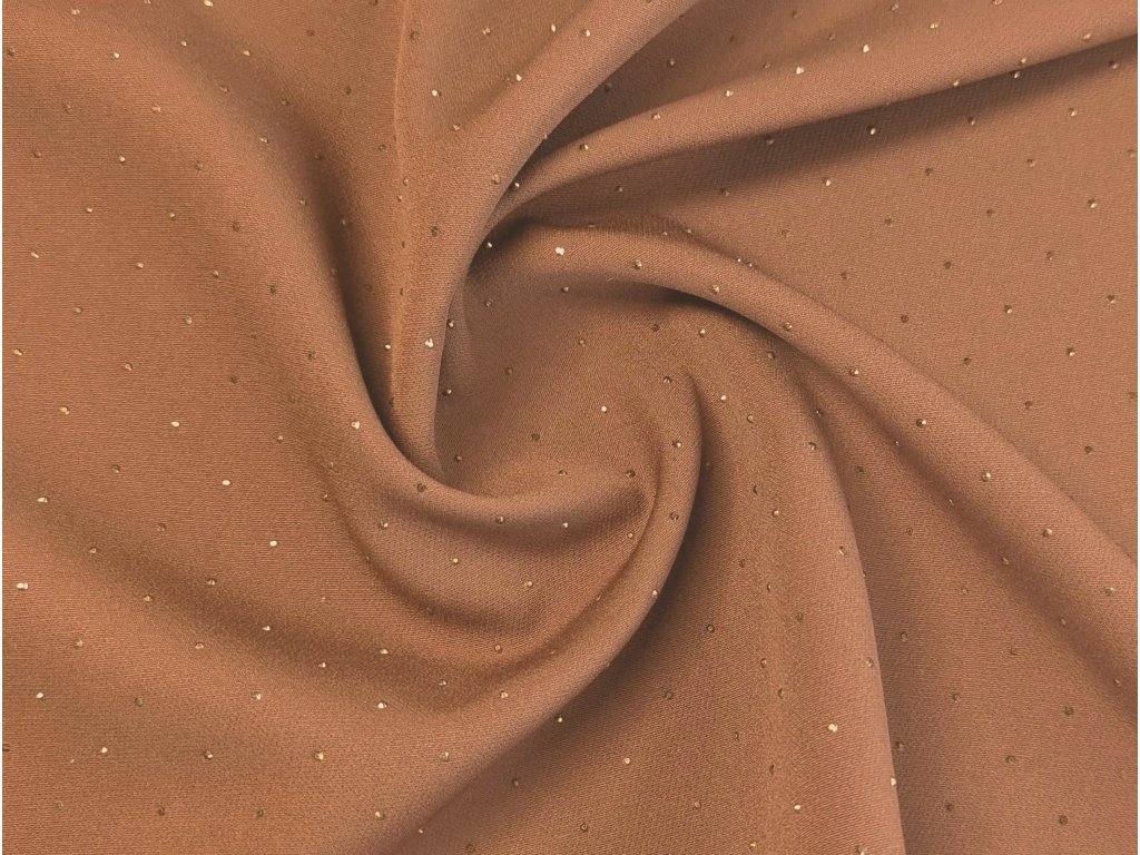 Světle hnědá krepová šatovka s aplikací umělých kamínků ve zlaté barvě, které vytvářejí jemný a vkusný třpytivý efekt. Látka je střední gramáže, mírně pružná, neprůhledná a příjemná na omak. Světle hnědá zdobená krepová šatovka je ideální volbou pro elegantní kostýmy, šaty, sukně, saka i kalhoty – nejen do společnosti.